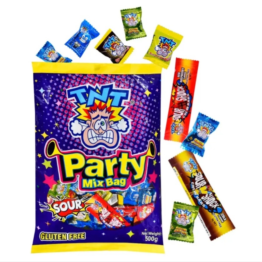 This Fun Bright and colourful party bag has a mix of all TNT's favourite wrapped lollies: sour shock chews, sour chew balls, sour chews liquid filled, sour spooky blobs and mega sour lollipops.